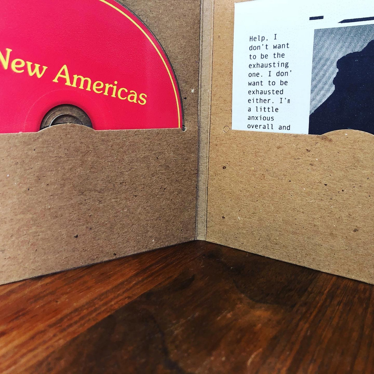 New Americas is presented for home listening on limited edition Compact Disc which is housed in an all natural recycled gatefold card sleeve with a hand glued cover and insert.